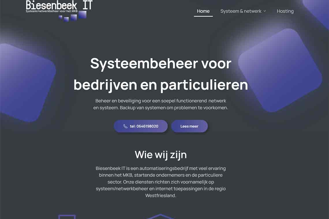 Redesign voor de website van Biesenbeek IT, Systeem en netwerkbeheer voor het MKB. www.biesenbeek.nl